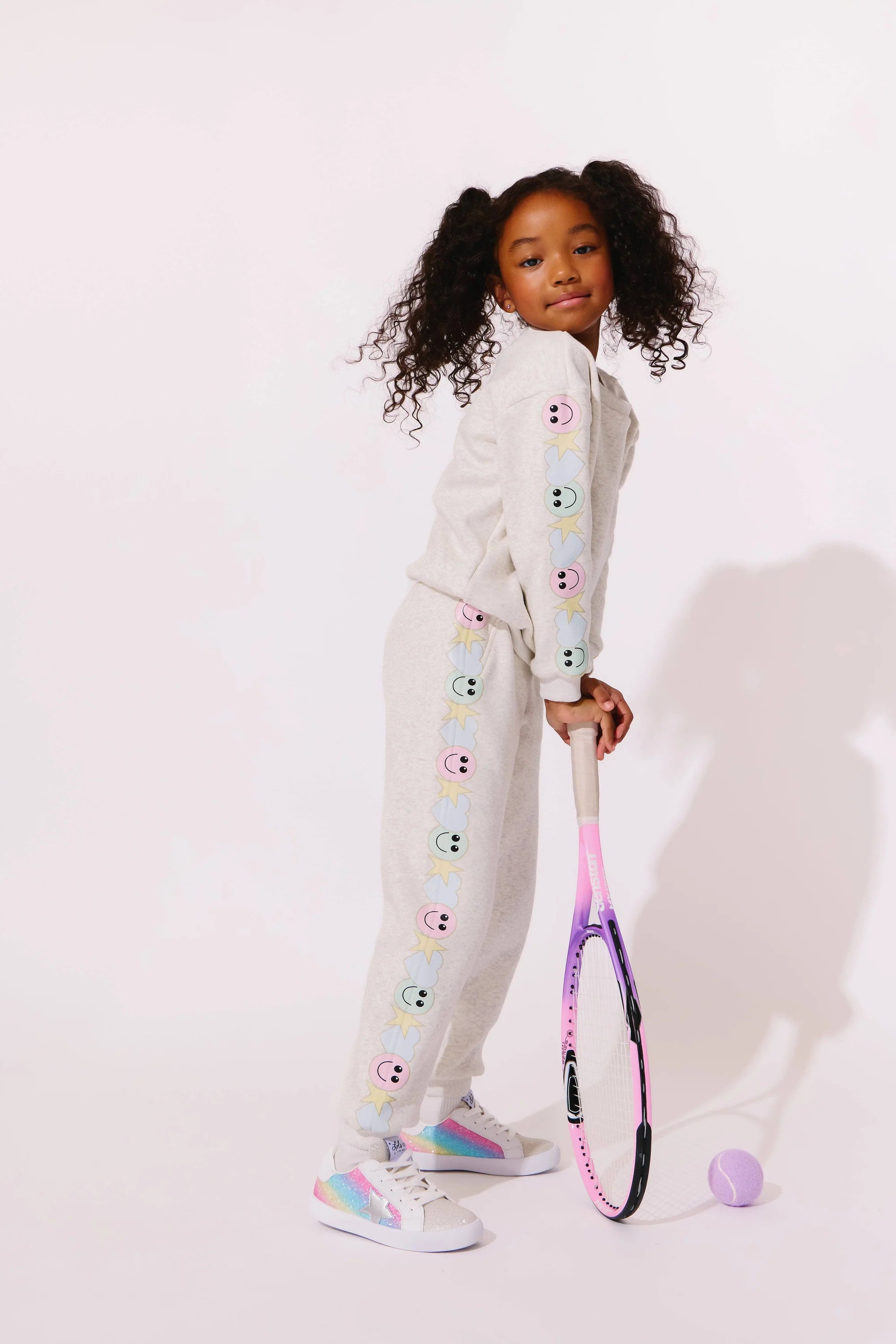 - Features adorable pastel smiley faces, stars, and hearts running down the sleeves and pant legs.