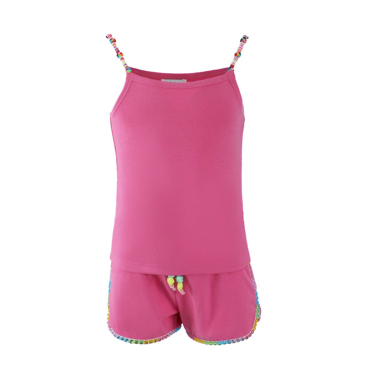 - Sweeten your style with this set, complete with colorful bead detailing on the straps and a fun trim on the shorts.